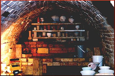 Pots stacked in the Hutchens' anagama kiln before firing.